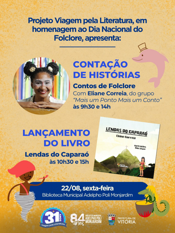 Na próxima sexta-feira (22), a Biblioteca Municipal Adelpho Poli Monjardim, no Centro Histórico de Vitória, se transformará em palco de encantamento para comemorar os 31 anos do projeto Viagem pela Literatura e celebrar o Dia Nacional do Folclore. Será um dia dedicado às histórias que atravessam gerações e mantêm vivas as tradições da cultura popular.