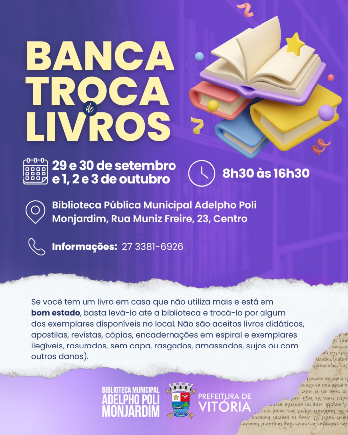 Para deixar para trás o que já floresceu em você e colher outra página de possibilidades, a partir da próxima segunda-feira (29) até sexta-feira (03/10), das 8h30 às 16h30, a Biblioteca Municipal Adelpho Poli Monjardim, no Centro Histórico de Vitória, abre espaço para mais uma edição da Banca Troca de Livros. Um convite simples e encantador: levar aquele livro em bom estado que já foi lido e carregar uma nova história para descobrir.