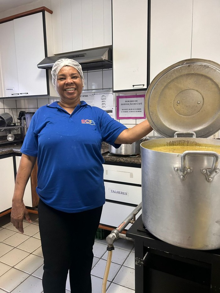 “Por 26 anos atuei como merendeira, ou seja, tinha que dar conta de produzir para 300 a 600 pessoas por dia. Aqui (no CCTTI), a produção é para um grupo de pessoas idosas animadas. Eu gosto do que faço. Tiro de letra. E ser a responsável pela produção da comida de um evento tão significativo e importante é um orgulho. Estou me achando o máximo”, declarou Maria da Penha.