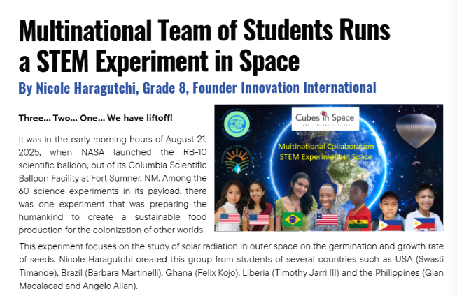 O experimento fez parte do programa Cubes in Space e foi lançado em agosto, a bordo do balão científico RB-10, em Fort Sumner, nos Estados Unidos. A iniciativa teve como objetivo aproximar jovens de diferentes países da ciência e da inovação, preparando-os para os desafios futuros.