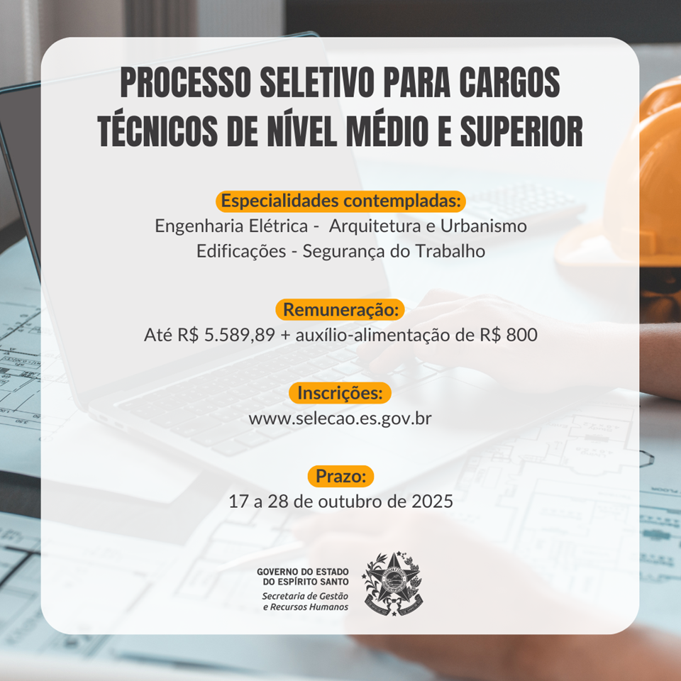 A Secretaria de Gestão e Recursos Humanos (Seger) abriu o Processo Seletivo Simplificado nº 046/2025, destinado à contratação em regime de designação temporária e formação de cadastro de reserva para cargos técnicos de nível médio e superior, na Região Metropolitana do Espírito Santo.