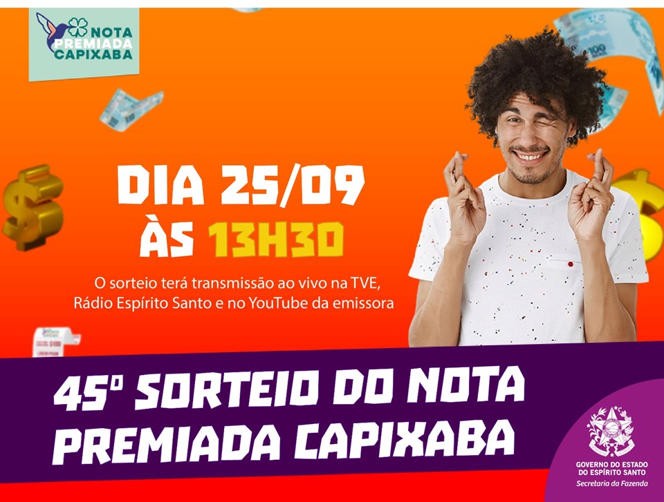 Pode começar a torcer: quinta-feira (25) tem sorteio do Nota Premiada Capixaba, o maior programa de educação fiscal do Espírito Santo, com transmissão ao vivo pela TVE Espírito Santo, pela Rádio Espírito Santo e pelos canais da emissora nas redes sociais, às 13h30.