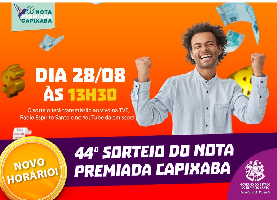 O próximo sorteio do Nota Premiada Capixaba, o maior programa de educação fiscal do Espírito Santo, já tem data e horário definidos. Nesta quinta-feira (28), a partir das 13h30 – novo horário fixo para os sorteios -, serão conhecidos os ganhadores dos 15 prêmios, que variam entre R$ 1,5 mil e R$ 25 mil. A transmissão continua sendo feita ao vivo pela TVE Espírito Santo, pela Rádio Espírito Santo e pelas redes sociais da emissora.