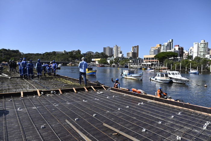 Na manhã desta terça-feira (26), o prefeito Lorenzo Pazolini acompanhou a primeira concretagem da laje que abrigará os equipamentos públicos. A infraestrutura projetada cobre aproximadamente 3,3 km de passeio público para pedestres e ciclistas, que será construído sobre a água, margeando as bordas do canal, totalizando 32.000 m² de área construída.