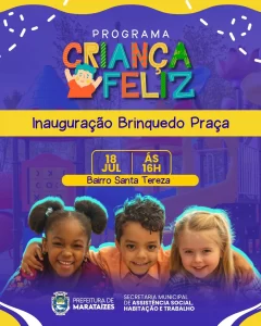A Prefeitura de Marataízes, por meio do Programa Criança Feliz, da Secretaria Municipal de Assistência Social, Habitação e Trabalho (Semasht), inaugura nesta sexta-feira, 18 de julho, às 16h, no Bairro Santa Tereza, a primeira Brinquedopraça do Sul do Espírito Santo. A iniciativa é uma parceria com os governos do Estado e Federal.
