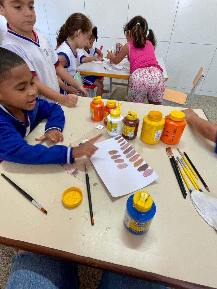 Durante uma das atividades, a professora Thaísa da Silva conduziu a leitura do livro “Nossas Cores”, que convida à reflexão sobre as diferenças e semelhanças entre os tons de pele, promovendo o respeito à diversidade e a valorização da identidade. As crianças participaram ativamente da criação de tintas personalizadas para montar uma paleta de cores da turma, explorando misturas e entendendo que não existe apenas uma “cor de pele”, mas muitas variações e nuances.
