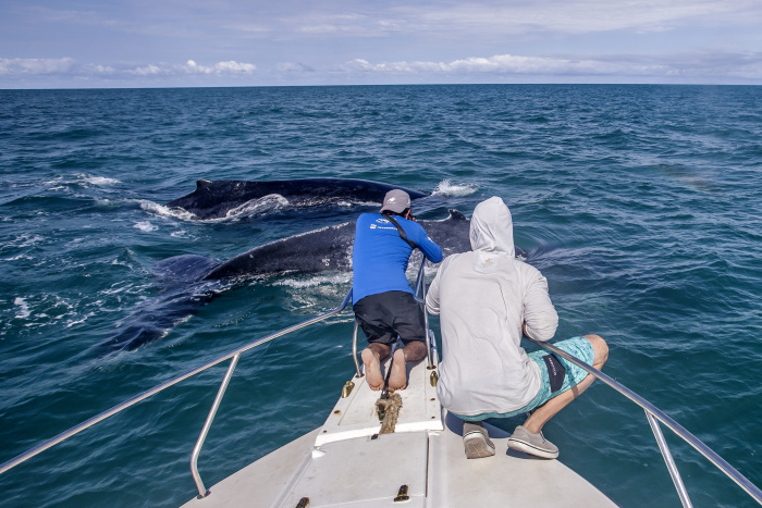 Uma dupla de jubartes chegou a se aproximar e ficou a apenas 70 metros da embarcação, proporcionando um momento de pura emoção e conexão com a natureza. A bordo, visitantes de várias partes do Brasil se encantaram com o encontro inesquecível com os gigantes dos mares.