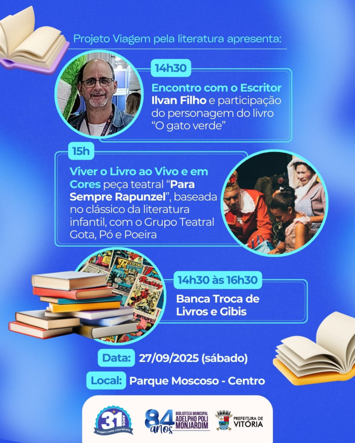 O Parque Moscoso se transformará em um grande palco da imaginação neste sábado (27). Das 14h30 às 16h30, o projeto Viagem pela Literatura, da Biblioteca Municipal Adelpho Poli Monjardim, desembarca no coração da cidade com um convite encantador: trocar, viver e sentir os livros de um jeito diferente.