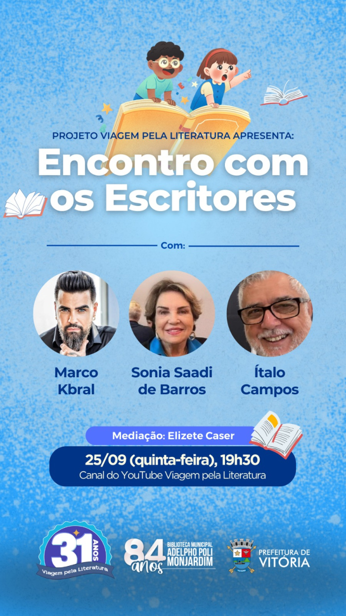 A Biblioteca Municipal Adelpho Poli Monjardim realiza, nesta quinta-feira (25), mais uma atividade “Encontro com o Escritor”, do projeto Viagem pela Literatura, com três nomes de destaque da cena cultural: Italo Campos, Sonia Saadi de Barros e Marco Kbral.